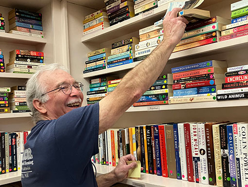 Paul restocking the bookstore shelves.
